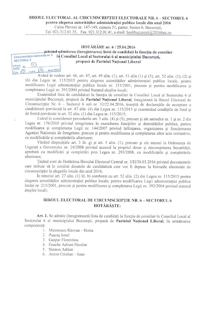 Hotărârea Nr. 6/25.04.2016, privind admiterea (înregistrarea) listei de candidați la funcția de consilier în Consiliul Local al Sectorului 6 al municipiului București, propusă de PNL.